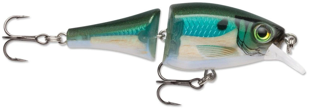 When the enthralling action of balsa wood and durability of hard plastic baits come together, the Rapala Balsa Xtreme Jointed Shad 06 Medium Diving Crankbait is what you get. Built on a balsa wood core and encapsulated with a co-polymer shell, this 2 1/2 inch lure provides distinct action that can withstand even the most extreme water conditions. With action enhanced by its jointed construction, 3D holographic eyes, and lifelike finishes, it exhibits realism in both function and form. It comes equipped with #8 VMC Round Bend Black Nickel Hooks. It can reach depths of 4 to 6 feet and can be cast and trolled effectively. Available in 10 color schemes.