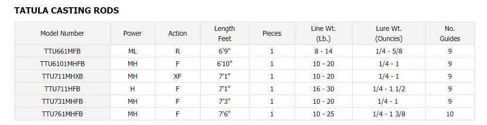 | TTU761MHFB | MH | F | 7’6″ | 1 | 10 – 25 | 1/4 – 1 3/8 | 10 |