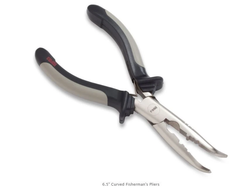 - The Rapala 6.5″ Curved Fishing Pliers feature a split shot crimper, a side cutter and double leaf spring