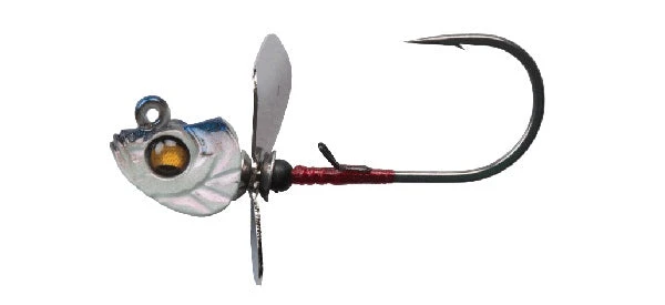 Megabass Okashira Screwhead is a screwhead jig head. It features an asymmetrical prop with one blade longer than the other to provide flash and vibration, and its head has lanes channeling water under the chin for increased stability at all speeds. The head also boasts a Super Slide hook and a hand-tied keeper to hold trailers. Available in 4 colors and 2 weights (1/16 ounce and 1/8 ounce), 3 pieces per pack.